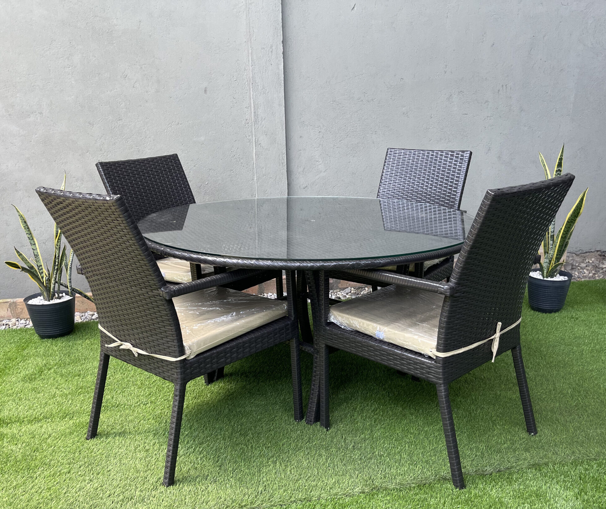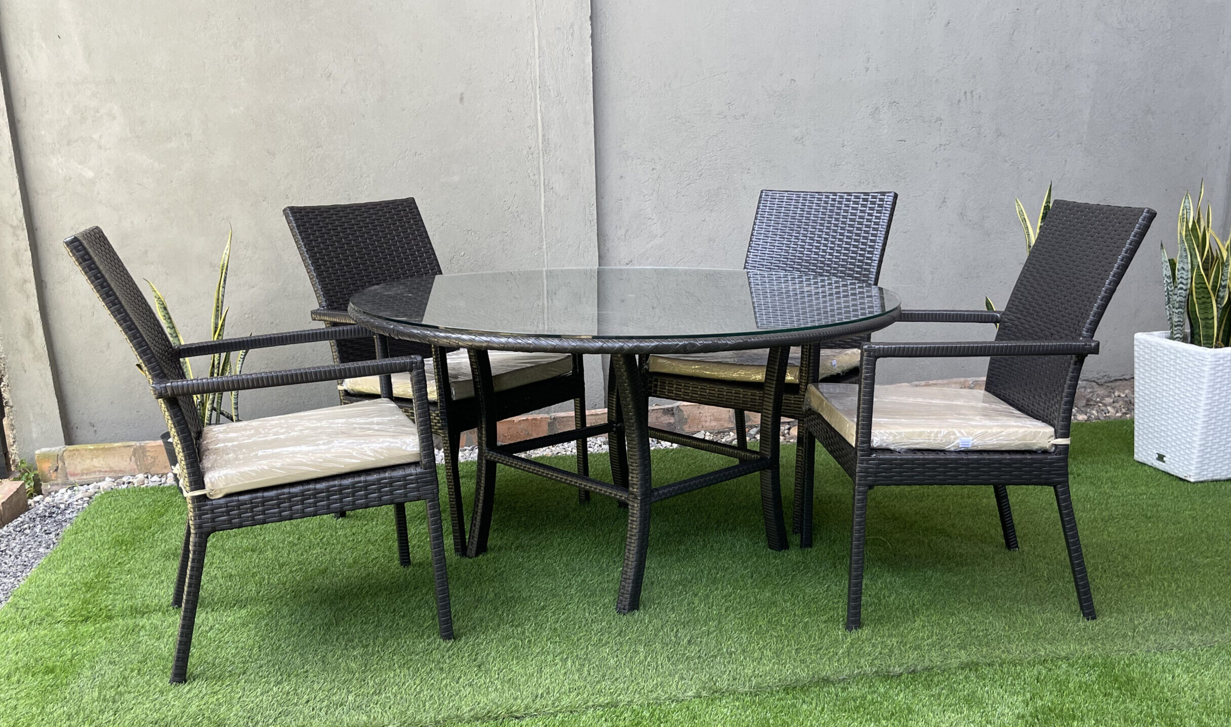 Fabricado en estructura de aluminio reforzado, con acabado en pintura electroestática. Tejido a mano en Rattan Sintético.